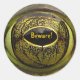 Este assustador adesivo do Dia das Bruxas mostra um olho de sapo verde. Sua íris é um incrível padrão abstrato de ouro e amarelo. O aluno preto puro e oval no centro reflete árvores a distância. O texto diz: Cuidado! Ele pode ser personalizado ou removido.