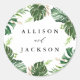 Coloque seus envelopes de casamento ou favoreça as bolsas com nossos adesivos personalizados Dourados Tropicais. Os autocolantes tropicais apresentam seus nomes cercados por uma coroa de folhas monstera de cor d'água com sotaques de folhagem dourados e verdes. Projetado para coordenar com a nossa coleção de casamento Dourada Tropical.