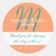 Aqua White Simple Casamento Inicial Favorito Obrigado Sticker. Personalize os seus favores de casamento com este elegante, simples e na moda, adesivo de casamento com turquesa e laranja e fundo, noiva e noiva, e monograma inicial junto com seu obrigado, sua mensagem e data de casamento impressos em letras elegantes. Design por Elke Clarke©. Esta é uma maneira excelente de personalizar os seus favores de casamento.