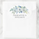 Flores brancas e cheias de pedras e folhas verdes de aquarela formam uma bela fronteira com os bonito adesivos de casamento florais e azuis para favores de chic jardim. Personalize com seus nomes sob o belo buquê.