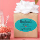 Um adesivo oval moderno "feito à mão com amor" com uma letra preta num fundo teal embelezado por um coração vermelho giro. Personalizar texto.