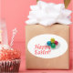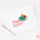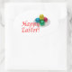 Felz pascoa de cor vermelha e placa de porcelana branca com quatro ovos pintados de cor azul, verde, vermelha e amarela. Impressões e presentes para todos