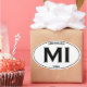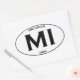 Este adesivo "MI" inclui legendas "Michigan" e "USA" sobre fundo branco. O estado de Michigan é composto por duas penínsulas; a Península Inferior teria a forma de uma luva. A Península Superior é frequentemente chamada de "U.P." Esta design é uma de uma série de adesivos ovais de Michigan que estão disponíveis em nossa loja.