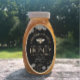 Vinheta de mel preto e preto, com design de abelha de mel heráldica medieval. Padrão de mel no topo e no fundo do oval. "Mel" é impresso em uma fonte metálica biselada. O nome do apiário é escrito em texto decorativo curvo sobre a abelha.