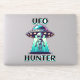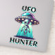 Alienígena e gráfico de OVNI para aqueles na OVNIlogia. Uma alienígena fofa sendo derrubada de um OVNI. Texto diz, "Caçador de OVNI" em autocolantes pretos e turquesas.