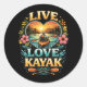 A serene heart-shaped lakeside scene celebrates the love of kayaking amid mountains, flowers, and golden sunset skies.
