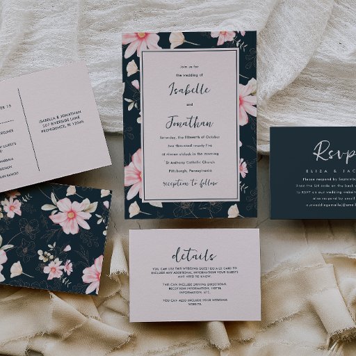 Lindas flores cor-de-rosa pinceladas e verde num elegante obrigado azul-escuro de fundo que você cola inclui um obrigado personalizável que você escreve e um lindo padrão floral botânico.