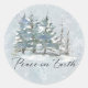 Uma bela paisagem de inverno de neve em aquarelas suaves de azul, verde e cinza transmite uma cena tranquila encontrada na natureza. O texto da caligrafia Peace on Earth acrescenta um toque contemporâneo à design. Estes autocolantes estão disponíveis em dois tamanhos diferentes. O tamanho pequeno faz um bom selo para seus cartões de natal e mensagens de correio ou para usar em pequenos presentes, favoritos para festas e artesanatos. O tamanho maior é uma boa escolha para presentes e pacotes maiores e outras festas e projetos de inverno.