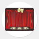Palco de teatro com cortinas, pistas e máscaras de comédia e tragédia
