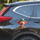 Palhaço de desenho animado vibrante com cabelos vermelhos brilhantes, olhos verdes grandes e um sorriso largo. Vestindo um chapéu roxo com faixa amarela, colarinho amarelo e camisa listrada, estendendo um gesto amigável.