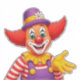 Palhaço de desenho animado vibrante com cabelo vermelho brilhante, olhos verdes grandes e um sorriso largo. Vestindo um chapéu roxo com faixa amarela, colarinho amarelo e camisa listrada, estendendo um gesto amigável.