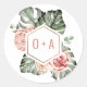 Folhas tropicais de palma e rosas rosadas poeirentas com adesivos monogramados.