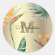 Sinta e compartilhe vibrações tropicais a qualquer momento usando este adesivo de nome personalizado lindo, chique, simples e moderno. Aves deslumbrantes e sofisticadas de flores de ave do paraíso em aquarela tropical colorida, brilho dourado falso e caligrafia personalizada com inicial de monograma em negrito, sobre um fundo de folha dourada falsa escovada glamorosa e elegante. Personalize com seu primeiro nome, sobrenome ou mensagem + monograma. Escolha entre várias formas e tamanhos. Use com orgulho em envelopes, sacolas de brindes e qualquer outra coisa que você queira personalizar! Causa um impacto estiloso toda vez que você o usa.