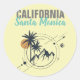 Um adesivo moderno de arte redonda apresenta Califórnia em cinza angustiada com Papais noeis Monica em uma fonte moderna de script aqua com palmas geométricas e montanhas logotipo gráfico em fundo amarelo pálido
