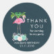 Etiquetas de festa com uma ilustração de um flamingo cor-de-rosa com palmeiras verdes atrás e um buquê decorativo floral suculento abaixo. Tropical e bonito. O fundo é azul escuro.