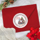Selo circular de envelope ou pacote "Feliz Natal" com Papai Noel aquarelado e caminhão vermelho vintage. O design apresenta um fundo cinza claro de aquarela nas bordas externas do círculo como pano de fundo para a neve. Basta personalizar com seu cumprimento, nome ou sobrenome e endereço de retorno, cidade, estado e CEP.