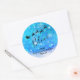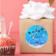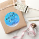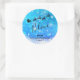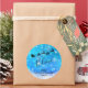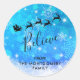 Etiquetas de Natal personalizadas com uma silhueta preta de Papais noeis a cavalgar no trenó sendo puxado por suas renas a voar pelo céu. Acredite que está escrito em uma fonte de script de tendência. O fundo é um design de floco de neve gelado azul gelado.