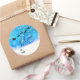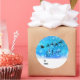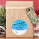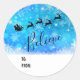 Etiquetas de presentes de Natal com uma silhueta preta de Papais noeis a cavalgar no trenó sendo puxado por suas renas a voar pelo céu. Acredite que está escrito em uma fonte de script de tendência. O fundo é um design de floco de neve gelado azul gelado.