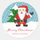 Este adesivo personalizável e festivo mostra a ilustração de desenho animado de Destei de um Papai Noel vestido com roupas tradicionais vermelhas e pretas. Os Papais noeis têm uma barba branca longa e ele está segurando a mão para dizer olá. Atrás dos Papais noeis há uma árvore de abeto verde coberta de neve. A cor de fundo é azul com um padrão de queda de neve. Na imagem, lê-se "Feliz Natal" em cor vermelha juntamente com uma área de texto personalizável para um nome personalizado, por exemplo.