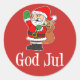 Deus, Jul, o adesivo de Natal sueco. Um ótimo adesivo para uma festa de Natal sueca. Ele apresenta um desenho animado de Santa. Diga Feliz Natal em Sueco com este adesivo festivo de férias em um fundo vermelho.