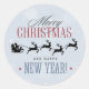 Vestidos de Natal festivos. Uma cinza sutil com flocos de neve. Rico com letra de tendência que diz: Feliz Natal e Feliz ano novo. Com um Papai noel preto de silhueta no seu trenó sendo puxado por sua rena voando pelo céu.