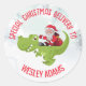 Papais noeis engraçados a montar uma entrega especial de Natal para dinossauros com o nome personalizado de criança.