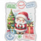 Um belo adesivo de Natal mostra um Papai Noel alegre segurando uma bebida quente, cercado por caixas de presentes coloridas e ornamentos vibrantes.