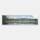 Uma ilustração digital colorida do Monte Rainier, a paisagem envolvente e o céu azul refletindo nas águas estáticas de um lago. O endereço do site da loja é impresso em um texto branco fácil de ler no adesivo do para-choques. Imagem Copyright ©2019 Kimberly J Tilley.
