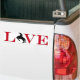 Um amortecedor divertido para amantes de rodeios com a palavra amor em letras grandes e vermelhas e uma silhueta de um cavaleiro que substitui o O.