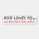 Texto simples lê Deus te ama; Nenhuma restrição se aplica. Sabemos que ele tem! Texto preto e vermelho em branco, borda com cinza.