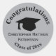 Adesivos com "Parabéns" pretos, boné, nome e "Classe de 20xx" em prata mate. Personalize com nome ou monograma inicial(s) e ano de classe usando o modelo fácil. A cor da fonte, o estilo da fonte, o tamanho da fonte e a cor de fundo prateado correspondente são personalizáveis. A maneira perfeita de felicitar o formando e celebrar a formatura.