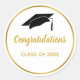 Um boné de formatura preto está no topo deste adesivo branco e fino de ouro. Você pode personalizar seus adesivos com sua mensagem sob o boné. (Mostrado: 'Parabéns Classe 20xx). O texto e a borda são dourados. O aspecto metálico-dourado é uma renderização artística, pois não é um adesivo de folha de alumínio.