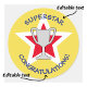 Este adesivo amarelo brilhante tem texto que você pode editar para suas próprias palavras de elogio. O padrão em azul escuro é "SUPERSTAR" e "PARABÉNS". A design apresenta um troféu (pode ser uma conquista esportiva ou acadêmica, por exemplo) com uma estrela vermelha e branca atrás dela.