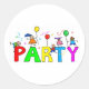 Um grupo feliz e diversificado de crianças subindo sobre a palavra FESTA.