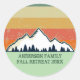 Legal adesivo de festa de reagrupamento familiar personalizado para um encontro de outono com primos, tias, tios e avós. Convide toda a tripulação com seu sobrenome e ano em verde ao redor da bela imagem do pôr do sol do outono sobre montanhas e árvores. design de viagem de acampamento personalizado do excelente.