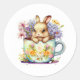 Este adesivo redondo é mostrado em branco com um coelhinho de Páscoa giro em um impressão de água de chá. Personalize este item ou comprar como está. Imagem do stock