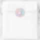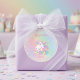 This sticker has an enchanted unicorn with a flowing multicolor mane on a soft watercolor rainbow wash with sparkle accents and customizable text. This whimsical fantasy design creates a magical look for a girl’s birthday celebration.
