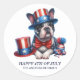 Um adesivo patriótico com um bonito buldogue preto e branco vestindo um chapéu vermelho, branco e azul listrado, e celebrando o 4 de julho. Personalizado com texto, "Feliz 4 de julho" e seu nome ou nome da família. Entre em contato comigo para obter assistência com suas personalizações ou para solicitar outros produtos Zazzle correspondentes ou coordenadores