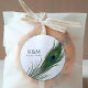 Um conjunto único de adesivos de casamento adaptados ao seu elegante evento de casamento. Ele apresenta uma imagem de uma elegante pena de pavão em direção ao lado. Do lado oposto disto estão as iniciais da noiva e do noivo e a data de casamento ou noivado.