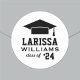 Os adesivos de festa de formatura redonda personalizados apresentam um design preto-e-branco (pode ser modificado através de "Personalizar!") com um boné de formatura e texto personalizado para o nome do formando e o ano de classe.
