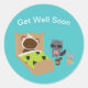 Um design bonitinho com um guaxinim, coelho e esquilo visitando seu amigo de urso doente. O texto diz, "Muito em breve", mas pode ser mudado e personalizado para ajustado das suas necessidades!