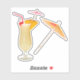 Um adesivo de vinilo de corte personalizado com a imagem de um guarda-chuva amarelo do coquetel e uma colada de pina em um vidro-tronco alto, formado com uma cereja, uma fatia de abacaxi, uma palha vermelha e um guarda-chuva rosa do coquetel. Este adesivo complementa nosso cartão de saudação "Pina Coladas" e é um excelente que termina o toque para selar o envelope. Consulte adesivo retangular correspondente, cartão de saudação, confetti, etiqueta de favor e papel de empacotamento. Veja toda a coleção Tubular 80s Sticker nos CONVITES | Seção Stickers & Labels