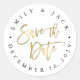 Chic e moderno salvem os adesivos de data que apresentam seus nomes e data de casamento em texto circular preto em volta de "salvar a data" em tipografia falsa de pincel em ouro. NOTA: não há impressão metálica ou em folha neste produto. O efeito da folha de ouro é obtido com uma imagem digital que usa sutis variações de cor para imitar a folha real. Sugerimos encomendar estes adesivos no acabamento brilhante para o aspecto mais realista.