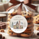 Um adesivo de "Feliz Natal" com uma bonito casa velha cercada por árvores nuas e pinheiros cobertos de neve. Personalizado com seu nome ou nome de família.