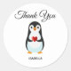 Pinguim fofo com coração em fundo branco Adesivo de festa de agradecimento. Ideal para aniversário, reuniões, chá de bebê e muito mais.