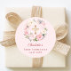 A soft blush pink background, decorated with watercolored pink and ivory flowers in a wreath and a golden cross. Personalize and add the name and date.