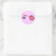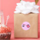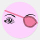 Estas t-shirts e outros artigos são impressos com um gráfico estilizado de um rosto que veste um olho-de-rosa claro.
