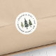 Os autocolantes russos para o seu negócio ao ar livre, aventura ou orientado para a natureza apresentam um trio de pinheiros verdes caçadores com dois campos de texto personalizados em um design circular curvo.