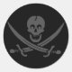 Aarrr! Esta é a nossa reviravolta original de um Jolly Roger com espadas grossas; você não vai encontrar em nenhum outro lugar se você navegasse pelos sete mares, varinhas escaldantes. O crânio rachado representa pensamento selvagem e livre e os olhos da lua significam sempre buscar aventura. Você não gosta? Ande pelo isco de peixe da prancha!