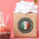 Este gráfico único mostra a bandeira da Itália que marcou dentro de uma estrutura metálica circular. A bandeira italiana tem a aparência de estar debaixo de um vidro com um reflexo luminoso visível no topo da design. A bandeira tem uma textura áspera adicionada que contrasta o acabamento liso da armação de aço inoxidável. Grandes rebites aparecem na estrutura circular, o que dá ao padrão uma forte aparência industrial. As chapas de aço envelhecidas são visíveis fora da armação, com uma malha de aço a aparecer atrás. Este design industrial tem uma sensação de galo e é uma na moda para mostrar seu patriotismo.